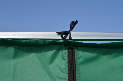 У чехла с лицевой стороны вшита молния с двойным замком, с помощью которой можно открыть или закрыть чехол. Крепится чехол к каркасу душа при помощи завязок.