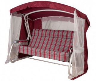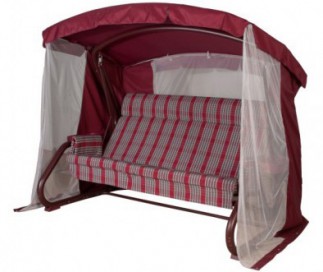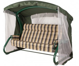 Тент у качелей садовых Марсель Премиум зелёные вместе с москитной сеткой. Если Вы хотите убрать москитную сетку, лицевую и заднюю часть москитной сетки скрутите в «трубочку» и закрепите карабинами.