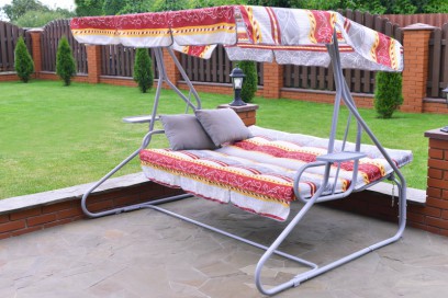 Мягкий элемент: ткань 45% п/э – 55% хлопок, плотность 108-111г/м2, наполнитель мягкого элемента 5см поролон + 3 см синтепон. Увеличенная высота спинки. Декор мягкого элемента тафтингом. Наполнитель подушек синтепон. Подушки – 2шт.